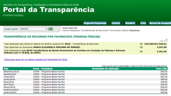 No Portal da Transparência do Governo Federal, Maria Elizângela figura como beneficiária do Bolsa Família que recebeu, de janeiro a setembro deste ano, R$ 2,2 mil do programa criado para superação da miséria no país.