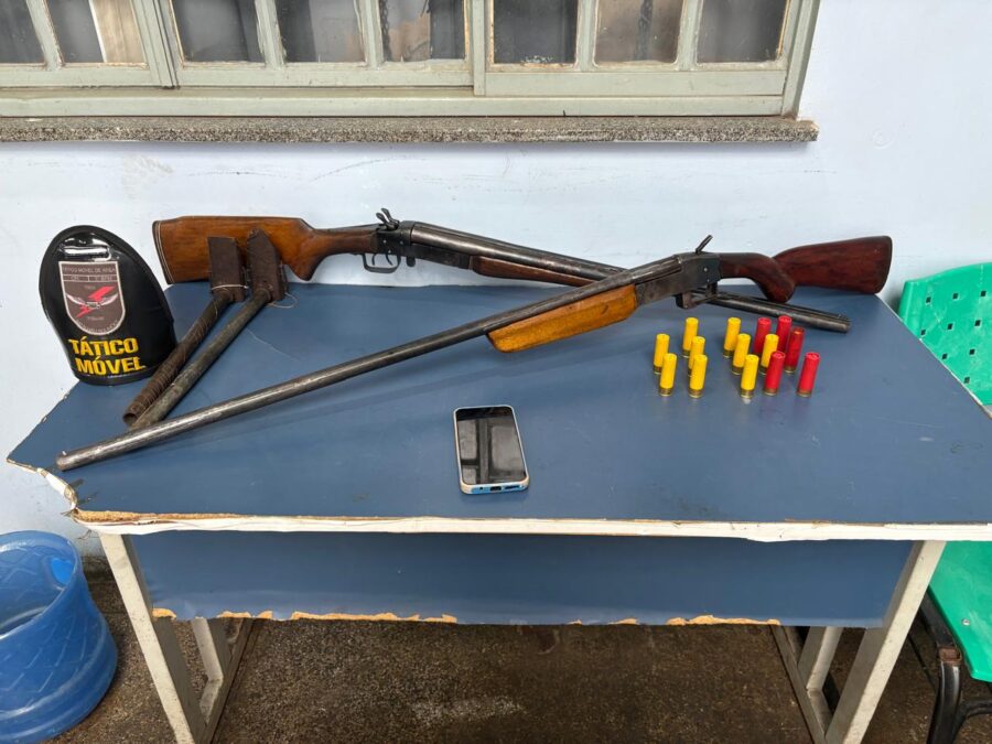 Os homens estavam em posse de duas armas de fogo e não apresentaram documentação necessária para o porte. Os policiais apreenderam 01 celular, 02 armas de fogo (espingarda), noventa e um reias e 15 munições intactas.
