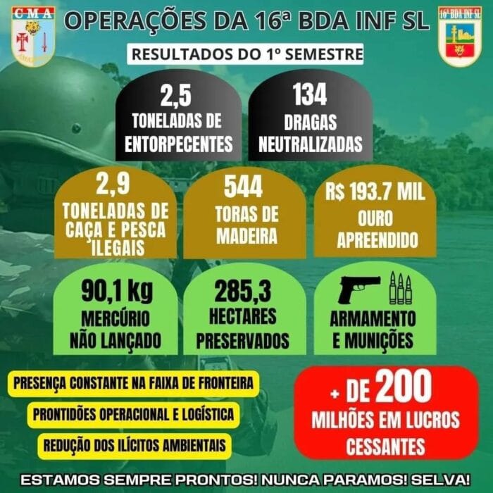Sempre voltada para a defesa da Pátria, o combate aos crimes transfronteiriços e ambientais, a preservação do meio ambiente e proteção e o bem-estar dos nossos amazônidas e povos originários, a 16ª Brigada de Infantaria de Selva divulga os resultados das suas operações singulares, conjuntas e integradas realizadas no primeiro semestre de 2024.