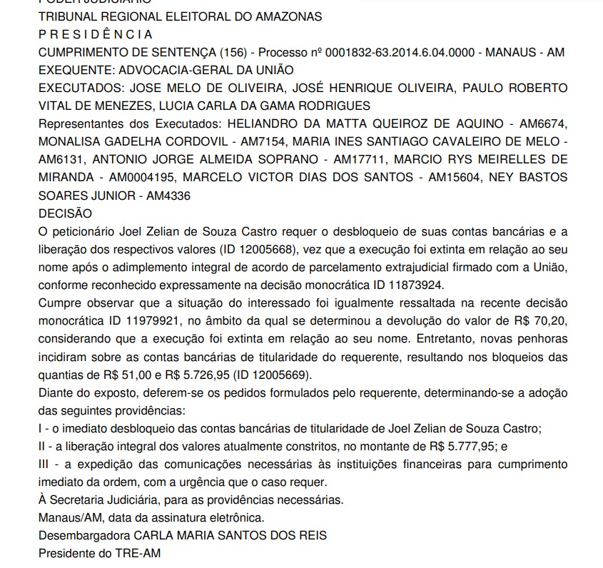 O Tribunal Regional Eleitoral do Amazonas (TRE-AM) decidiu pelo desbloqueio de contas bancárias no âmbito de um processo de cumprimento de sentença que envolve o ex-governador José Melo de Oliveira e outros executados. A decisão foi assinada pela presidente da Corte, desembargadora Carla Maria Santos dos Reis.
