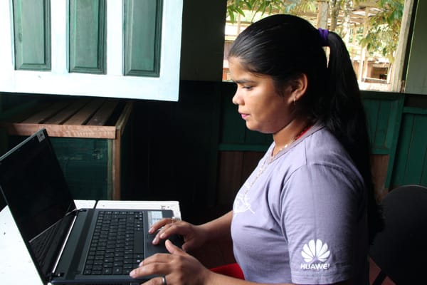 “Para tirar uma nota fiscal, a gente tinha que viajar até Manaus. Com a internet, agora vamos poder fazer aqui mesmo. Vai ser mais fácil manter contato com os clientes, por e-mail, e divulgar mais nosso artesanato”, conta a artesã Marly das Chagas Oliveira, presidente da Associação de Mulheres Teçume da Amazônia.
