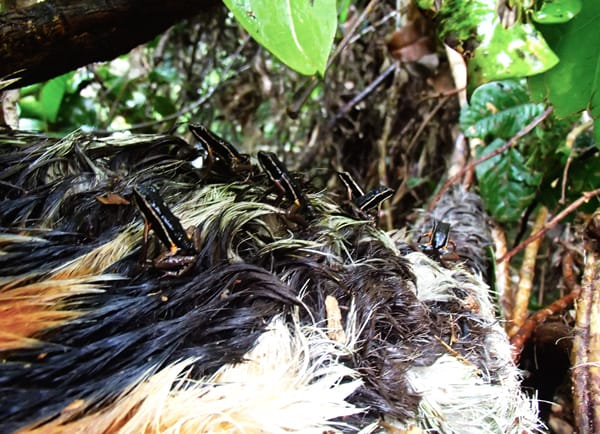 Durante uma expedição de campo, no período da cheia, os pesquisadores do Instituo Mamirauá se depararam com uma surpresa. Era uma atividade de monitoramento de onças-pintadas, mas os animais que surpreenderam os cientistas foram pequenos sapos da espécie Ameerega hahneli. Sobre um resto de carcaça abandonada por uma onça, mais de 15 indivíduos estavam agrupados, sem apresentarem comportamento combativo (veja imagem acima). Muito territorialistas, os sapos desta espécie têm comportamento agressivo quando outros sapos tentam ocupar o seu espaço.
