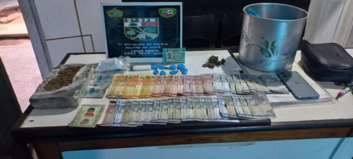 Ao todo, foram apreendidos R$ 430 em espécie, um celular da marca Motorola de cor azul, uma bolsa preta com documentos, um tablete de skank pesando aproximadamente 718 gramas, uma porção da mesma substância com cerca de 12 gramas, oito porções de pasta base de cocaína, material plástico para embalo e uma panela com forte odor e resquícios de droga.