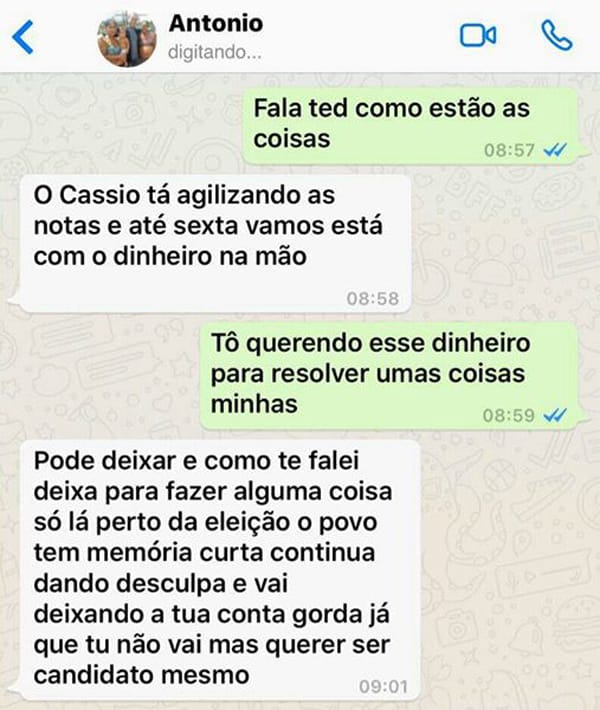 Sobre o teor da conversa acima,divulgadas na internet, o gestor afirma que ” em momento algum eu usei da minha função como prefeito para tentar qualquer tipo de favor pessoal. Fizeram uma montagem altamente falsa, com erro de perfil, leitura de conversa e uma linguagem que jamais utilizei. Peço que observem a imagem. Prestem atenção no “VISTO AZUL”, se fosse eu quem estivesse enviado as mensagens, não estariam com visto azul e sim branca sem o visto.