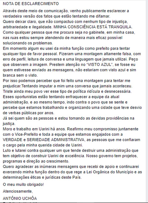 O prefeito de Uarini, Antônio Uchoa(PMN) usou a página da Prefeitura em uma rede social, na sexta-feira(11), para esclarecer os fatos que envolvem seu nome e do assessor Ted Onlo em uma suposta conversa, via aplicativo de mensagens: