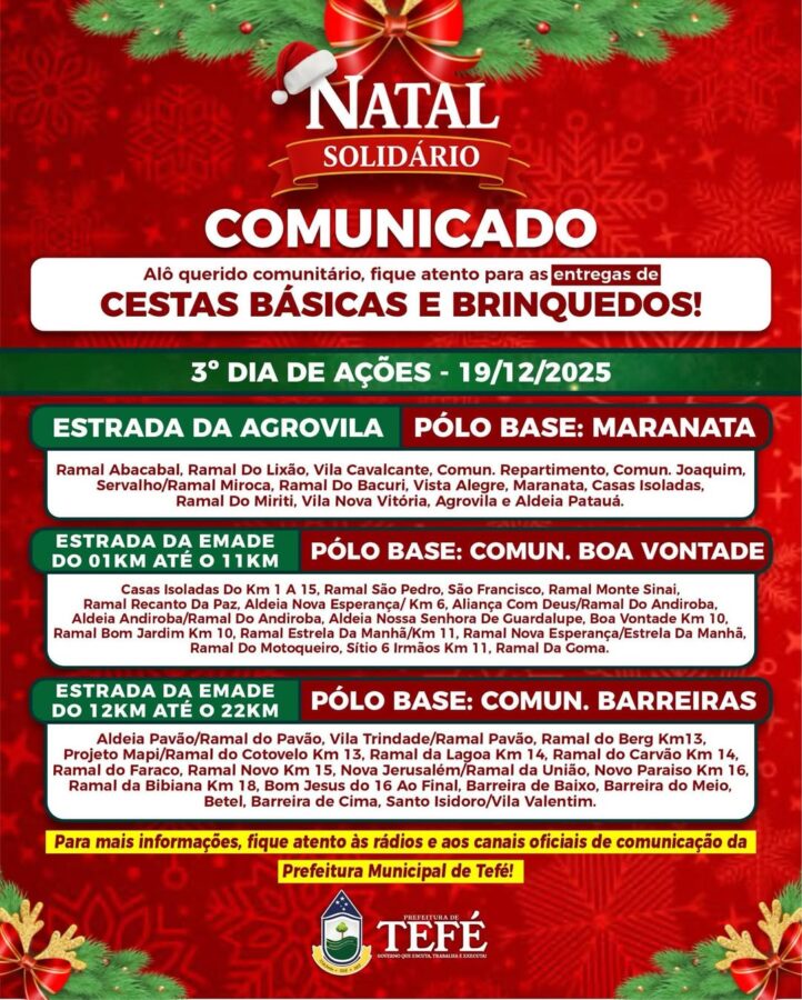 Com o Natal Solidário, a gestão municipal reafirma seu compromisso de levar políticas públicas a todos os cantos de Tefé, promovendo um Natal mais humano, solidário e digno para quem mais precisa.