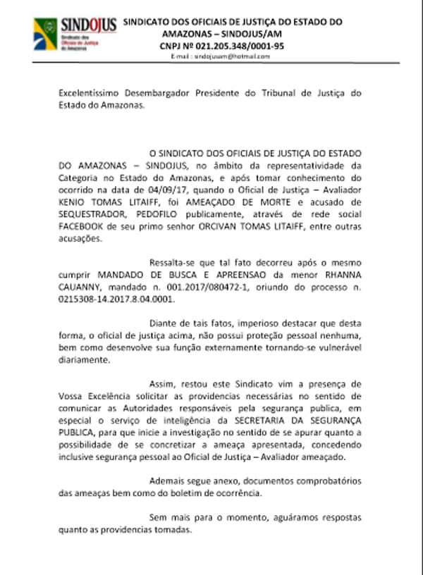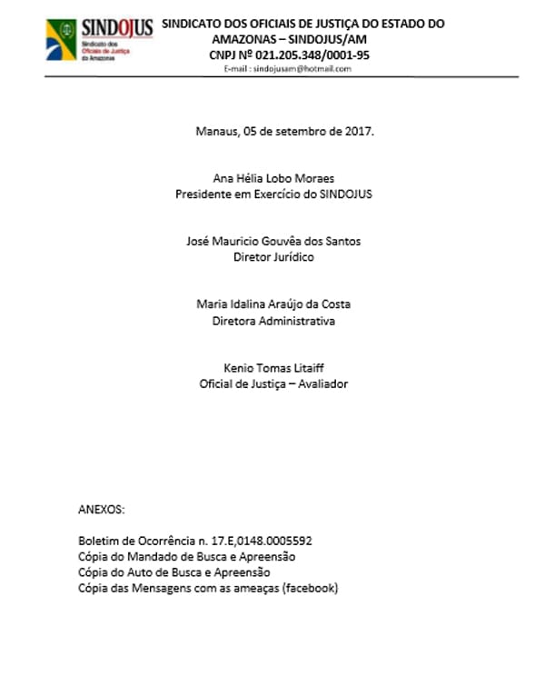 O sindicato dos Oficiais de Justiça do Estado do Amazonas – SINDOJUS, enviou documento, nesta terça-feira(05), para o Presidente do Tribunal de Justiça do Amazonas(TJAM), no qual expõe as ameaças sofridas pelo Oficial de Justiça, Kenio Tomas Littaiff, em razão do cumprimento de um mandado de  busca e apreensão, e solicita que seja comunicado às autoridades, responsáveis pela segurança pública, em especial ao Serviço de Inteligência da SSP, para que inicie a investigação no sentido de apurar quanto a possibilidade de se concretizar a ameaça apresentada e que seja disponibilizada segurança pessoal ao funcionário, em razão da vulnerabilidade diária que o mesmo apresenta.
