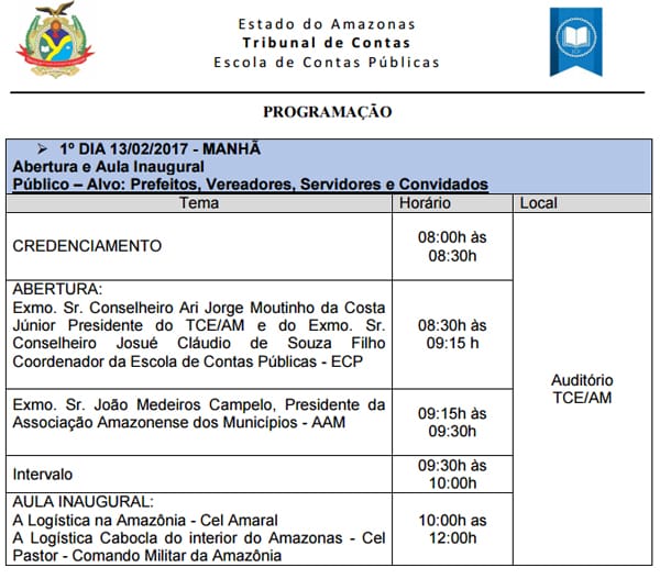A Aula Inaugural, que marca o início das atividades da Escola de Contas do ano de 2017, será ministrada por dois oficiais do Comando Militar da Amazônia: coronel Manoel Fernandes Amaral Filho e tenente-coronel Lauro Augusto Pastor Almeida, que falarão, respectivamente, sobre a “Logística na Amazônia” e a “Logística Cabocla do Interior do Amazonas”.