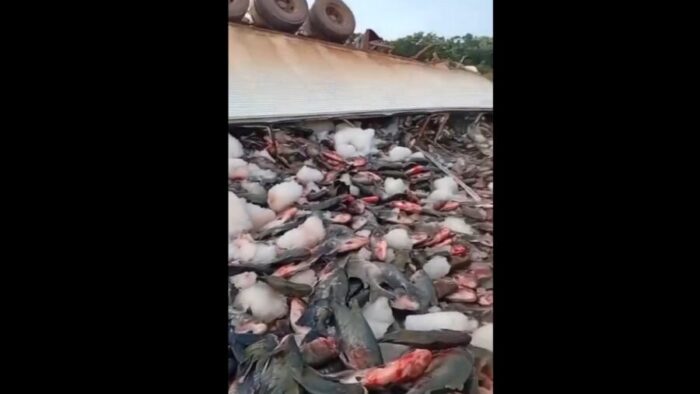 A carreta estava lotada, e a quantidade de peixe pode ser considerada em toneladas ou centenas de quilos.