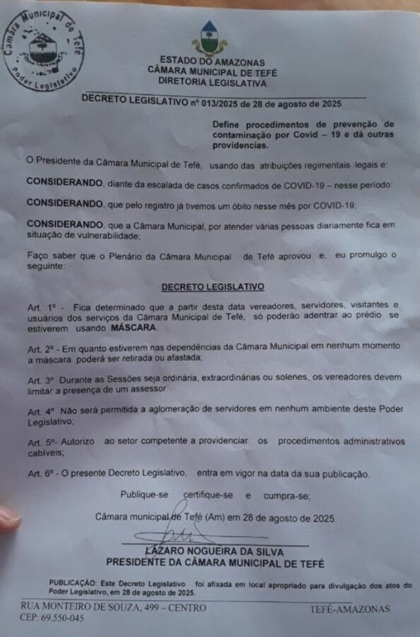 Na tarde desta quinta-feira (28), o presidente da Câmara Municipal de Tefé, Lázaro Nogueira da Silva, decretou o uso obrigatório de máscaras dentro das dependências da Casa Legislativa. A medida foi tomada após o aumento de casos confirmados de Covid-19 no município e o registro de óbito neste mês.