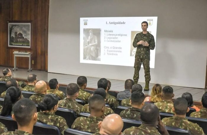 Abrindo as atividades, o 2º Tenente Filipe Costa apresentou a palestra “Líderes da História”, destacando personalidades que marcaram época e influenciaram gerações. Em seguida, o Major Stênio falou sobre “Liderança Militar”, ressaltando a ética, a disciplina e a legitimidade como bases essenciais para a condução de tropas em ambientes de alta complexidade.