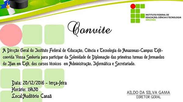 Um total de 100 alunos dos cursos técnicos de Administração, Informática, Contabilidade, e Secretariado participarão nesta terça-feira(20) da primeira formatura do Instituto Federal de Educação. Ciência e Tecnologia do Amazonas/Campus Tefé.