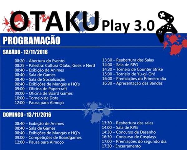 “Esse é um evento feito de fã para fã, totalmente voltado para a galera que curte Animes, Games, Mangás, HQ’S, RPG, Séries, Filmes, Rock, boardgames e afins. Teremos também torneios de CS, Dota, Yu Gi Oh, concurso de desenho, concurso de Cosplay, oficina de PaperCraft e shows ao vivo,” disse Wilkens Barbosa, um dos organizadores do evento.