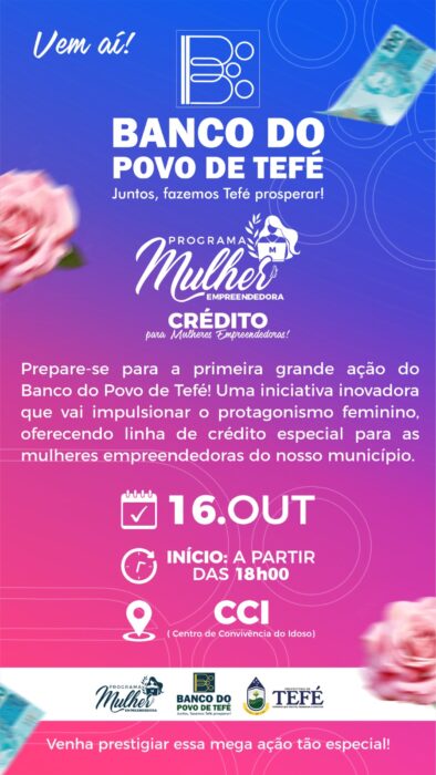 A Prefeitura de Tefé convida todas as mulheres empreendedoras — e aquelas que desejam conhecer o Banco do Povo e as novas oportunidades de crédito — a participarem do evento.