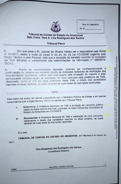 O pleno acompanhou o voto da relatora da matéria, na época a conselheira Yara Lins. No seu voto a conselheira lista uma série de irregularidades encontradas no certame e determina à prefeitura de Tefé a anulação do concurso e ainda recomenda a realização de um novo concurso público e a devolução da taxa de inscrição aos candidatos inscritos.
