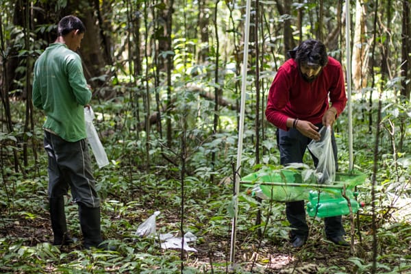 Para realizar uma parte do trabalho, foram instaladas seis parcelas florestais – áreas delimitadas que funcionam como “amostras” de florestas na pesquisa – em diferentes tipos florestais da Reserva de Desenvolvimento Sustentável Mamirauá: várzea baixa, várzea alta e chavascal, que passam por níveis diferentes de alagação. As áreas estão sendo monitoradas regularmente. São coletadas amostras de serrapilheira, que é a matéria orgânica depositada na floresta, composta por folhas, galhos, flores, frutos e outros. A ideia dessa etapa, como explica Jefferson, é compreender como a floresta devolve, ao ambiente, o carbono absorvido em forma de gás da atmosfera.