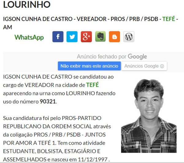 Igson Cunha de Castro, disputou uma vaga para a Câmara de Vereadores pelo PROS, na coligação que teve como majoritário Wiseman Celane, nas eleições municipais de 2016, com o registro de Lourinho, obtendo 59 votos.