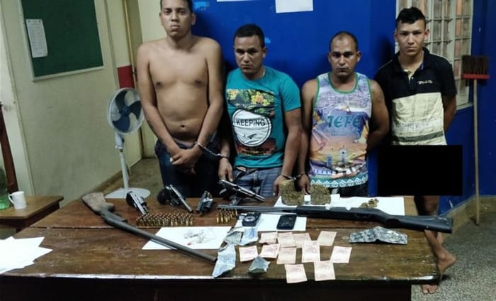 Com eles, foram encontrados três revólveres calibre 38 com numeração raspada, uma pistola 9 mm com numeração raspada, uma espingarda calibre 16, 82 Munições calibre 40 e 9mm, uma carabina de ar comprimido, 1kg de maconha tipo skunk, 100 gramas de substância em pó com aparência de cocaína, um motor rabeta de 10hp, uma canoa, uma moto Honda Bros, um celular e a quantia de R$250,00.