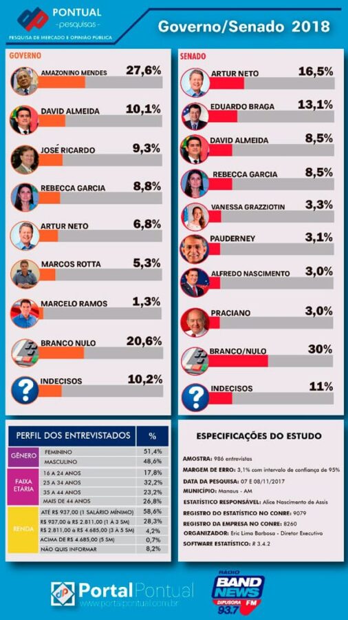 Para governo, Amazonino Mendes lidera a pesquisa com 27,6% das intenções de votos, seguido por David Almeida com 10,1%. Atrás do atual governador Amazonino Mendes, temos um pelotão composto por David Almeida, Jose Ricardo com 9,3% e Rebeca Garcia com 8,8% empatados tecnicamente considerando a margem de erro.