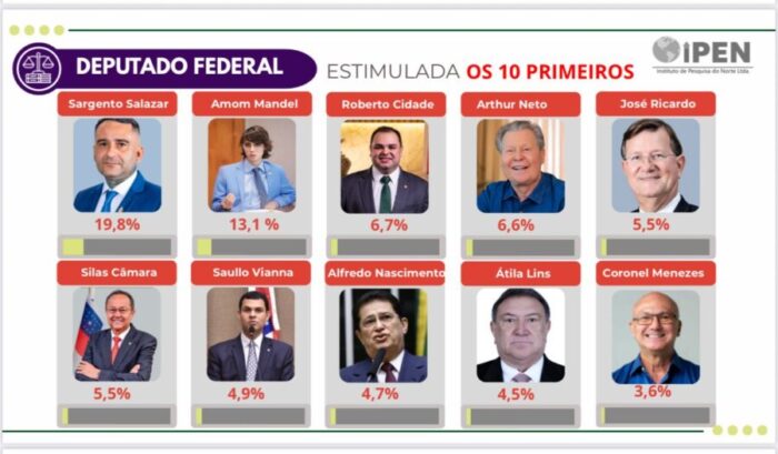 Metodologia – A pesquisa foi realizada pelo Instituto de Pesquisa do Norte Ltda. (IPEN) entre os dias 14 e 24 de novembro de 2025. Ao todo, foram entrevistadas 1.504 pessoas em 12 municípios: Manaus, Parintins, Itacoatiara, Manacapuru, Coari, Maués, Presidente Figueiredo, Iranduba, Careiro, Borba, Autazes e Tefé. A margem de erro é de 2,52%, com nível de confiança de 95%. O estudo está registrado no Conselho Federal de Estatística, sétima região, sob o número 30, e foi contratado pelo Consórcio de Portais do Amazonas G6.